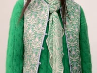 Seine Trapezform macht ihn sehr besonders und seine Mischung aus Seide und Kaschmir ist luftig und anschmiegsam. Er wird in der Manufaktur handgewebt und anschließend im Handsiebdruck bedruckt.