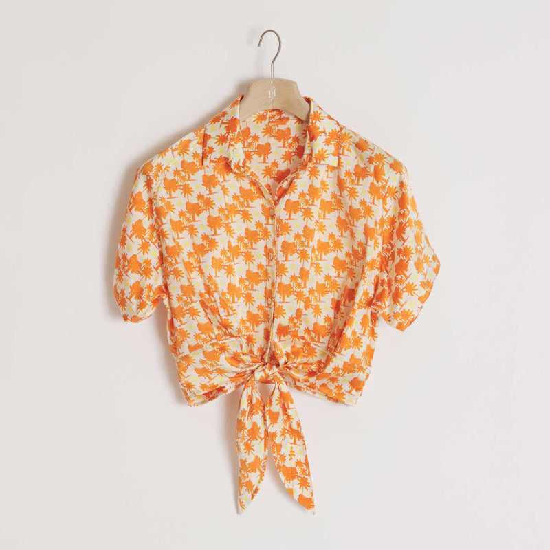 Kurz geschnittene Bluse aus fließender Seide im All Over Print Palm Spring. Die Bluse überzeugt mit einer aufgesetzten Knopfleiste, Hemdkragen und einem Bindedetail. Das Shirt kann einzeln oder im Set mit dem passenden Skirt Estoy Palm Spring getragen werden.